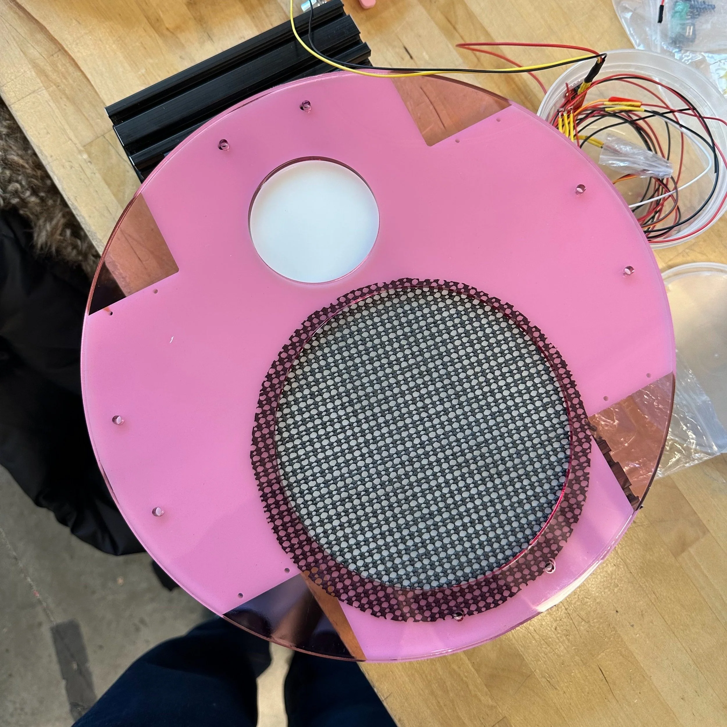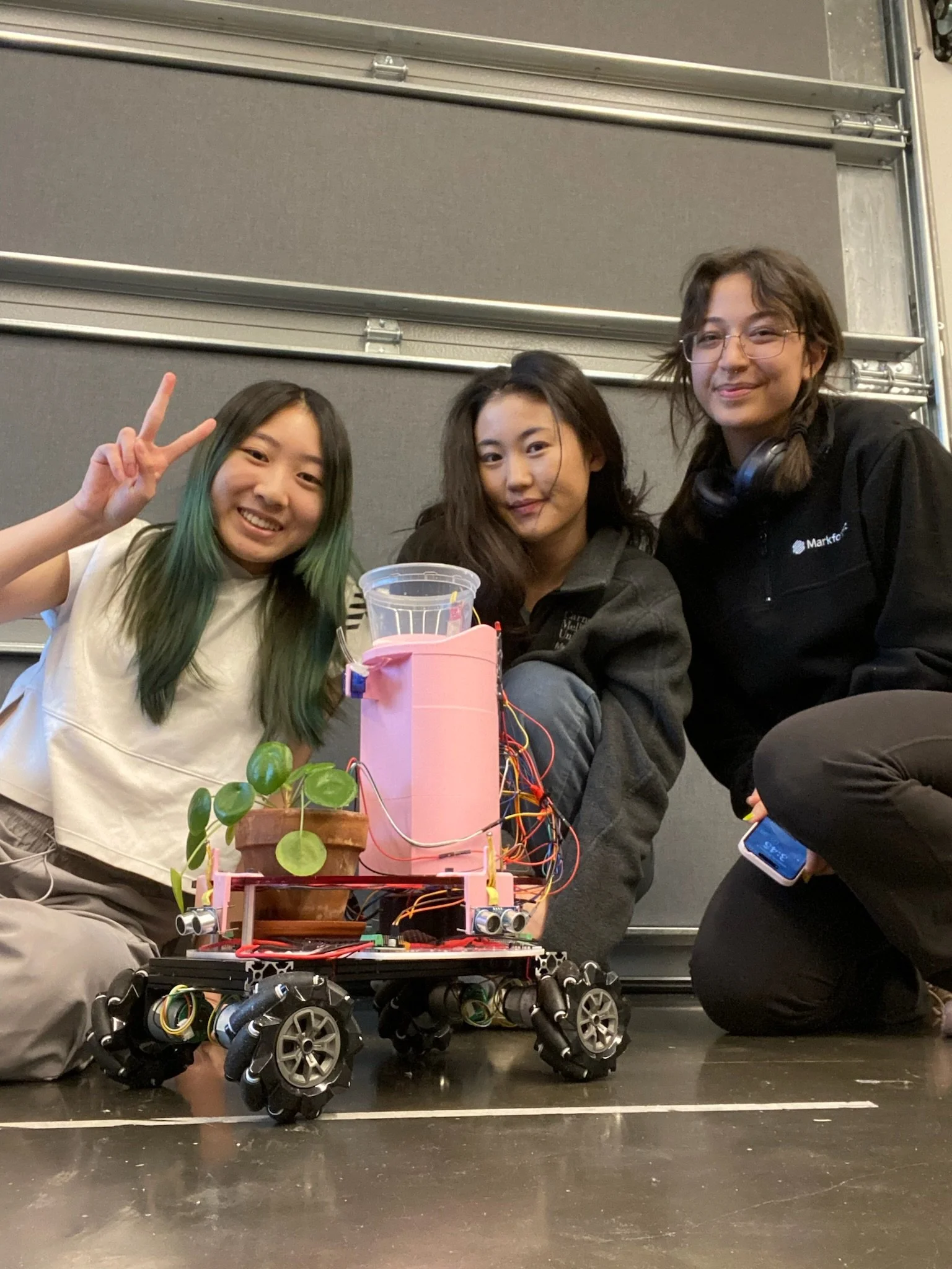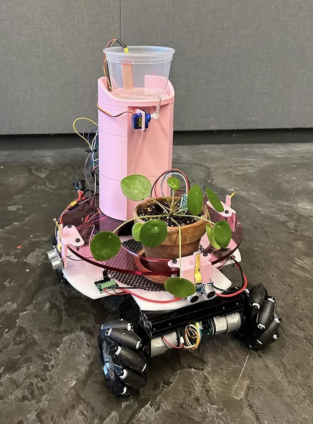 The foundation of the chassis consists of an aluminum frame with mecanum wheels mounted on for omnidirectional drive, to ensure that the robot is fully capable of navigating around obstacles with ease and easily travels to bright areas in the room. The acrylic chassis is held together with standoffs and has holes laser cut for easy addition of motor controllers and ultrasonic sensors. Additional holes in the top, pink layer of the acrylic include a hole beneath the water tower to feed wires through, and a hole to keep the plant pot stable.