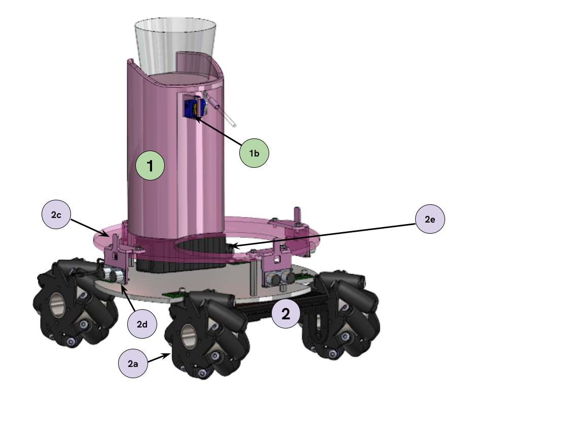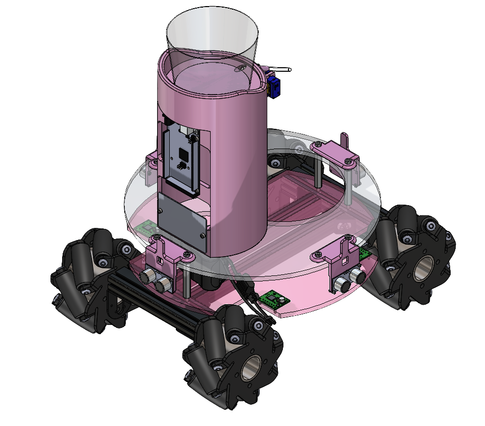 All mechanical design components were fabricated using a Bambu 3D printer and by laser cutting, as these manufacturing processes were the fastest and most efficient use of our time and budget. Components such as the ultrasonic motor mounts and the water tower were 3D printed using pink matte PLA to easily produce the complex geometries needed and to match with the robot’s design and aesthetics. The chassis base was laser cut from acrylic in order to quickly make a precise and solid foundation for the robot.