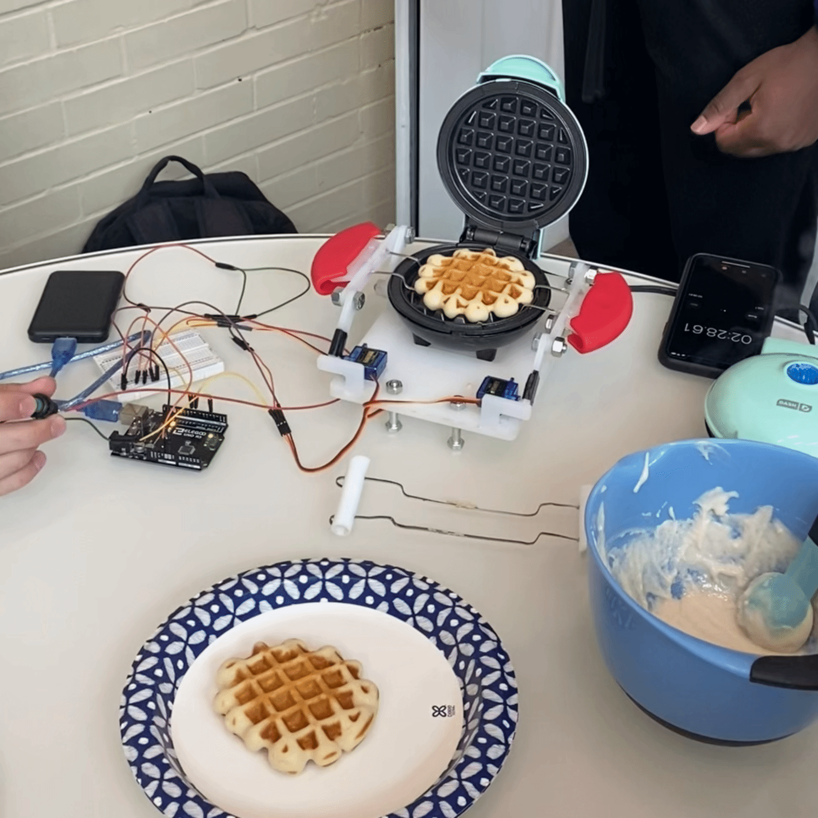 This project was, to put it simply, so fun. It would’ve been great to have more time to automate it even more, with an added timer to force sensors, which could detect when batter was placed in the waffle maker, so then the timer could start, and no button would be needed to lift the waffle out. Although there are many things I can think of refining, looking back on this project as a current M.S. student, this project was a major stepping stone in growing my passion for mechanical and electromechanical design!