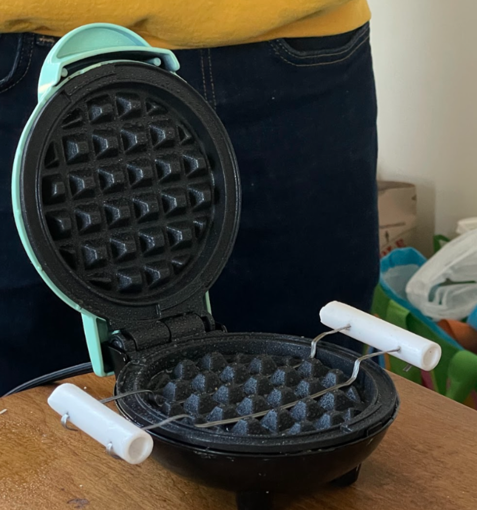 Based on our early ideation, we decided to continue with our sheet metal model, as initial testing proved successful. We learned that the bamboo stick model kept the waffle maker too open, which impacted waffle quality. The thin sheet metal, however, was able to keep the waffle maker closed enough for its waffles to have similar quality to the unmodified waffle maker.