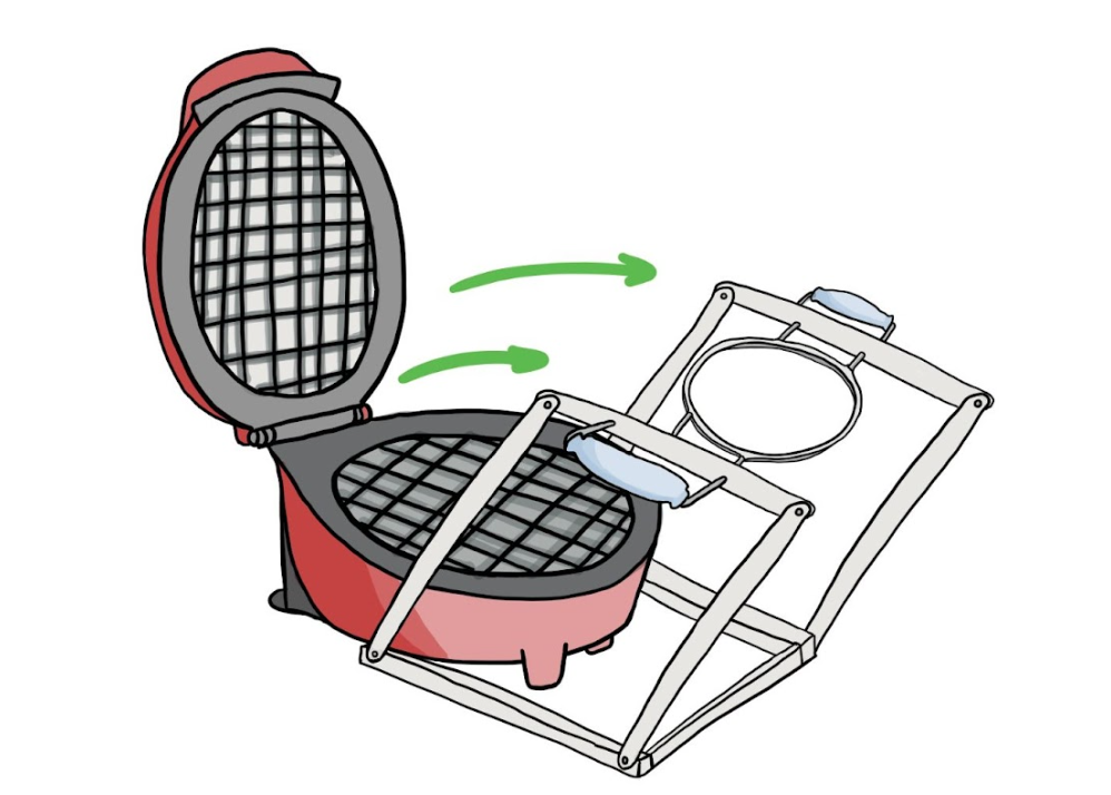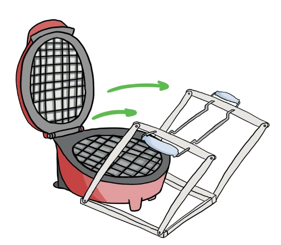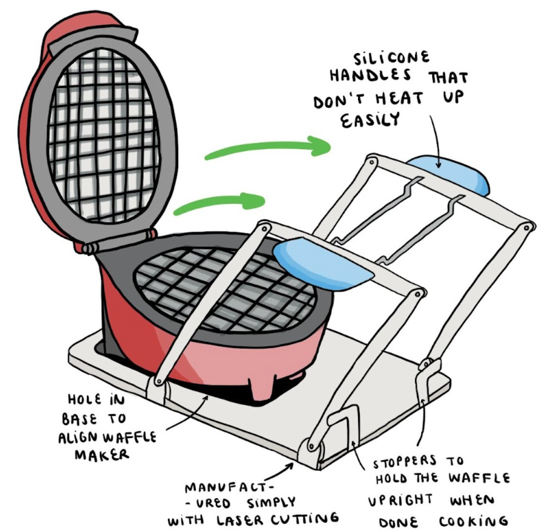 A solution we conceptualized, shown in a FEW sketch below, was a base that allows the user to lift the waffle safely and a linkage system that brings the base and waffle out of the waffle maker. We initially ideated and prototyped two different bases - one using bamboo sticks and one made of sheet metal and insulated handles which go under the waffle. We tested both bases during our preliminary data collection.